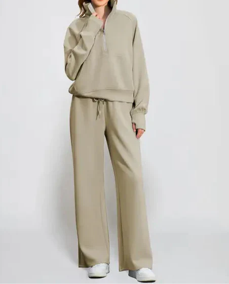 Discover the perfect blend of comfort and style with the Maya Luxe Lounge Set. Crafted from a soft yet structured fabric, this two-piece ensemble features a half-zip funnel neck top and relaxed wide-leg pants, providing a flattering silhouette without clinging. Ideal for leisurely mornings, casual outings, or cozy evenings at home, this set ensures you look polished while feeling completely at ease.
